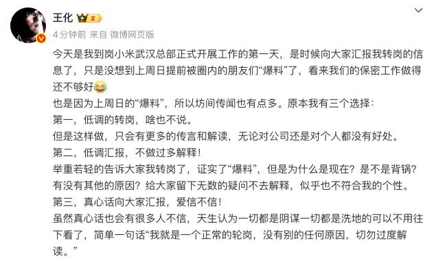对此,王化在社交媒体平台表示称,“今天是我到岗小米武汉总部正式开展工作的第一天,是时候向大家汇报我转岗的信息了。”王化特别强调:简单一句话“我就是一个正常的轮岗,没有别的任何原因,切勿过度解读。”