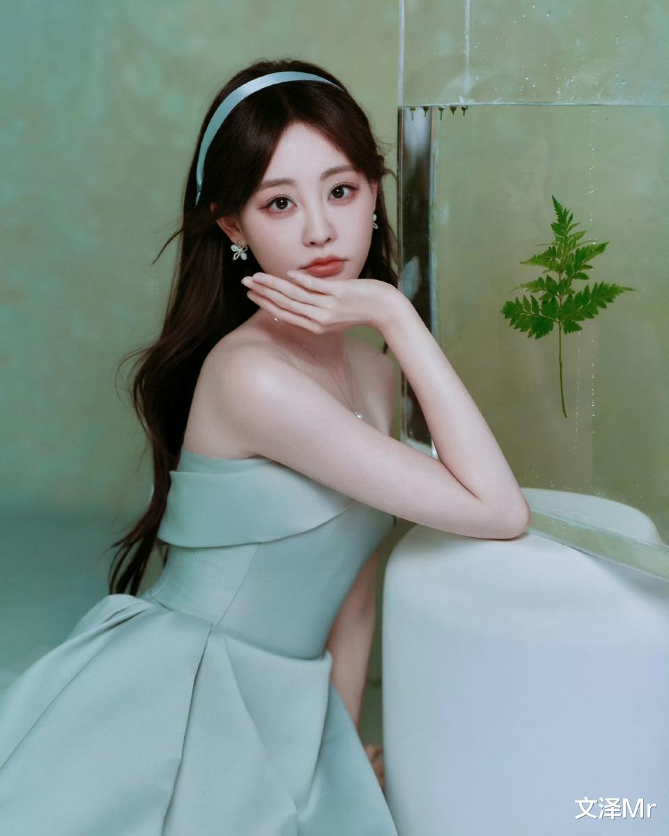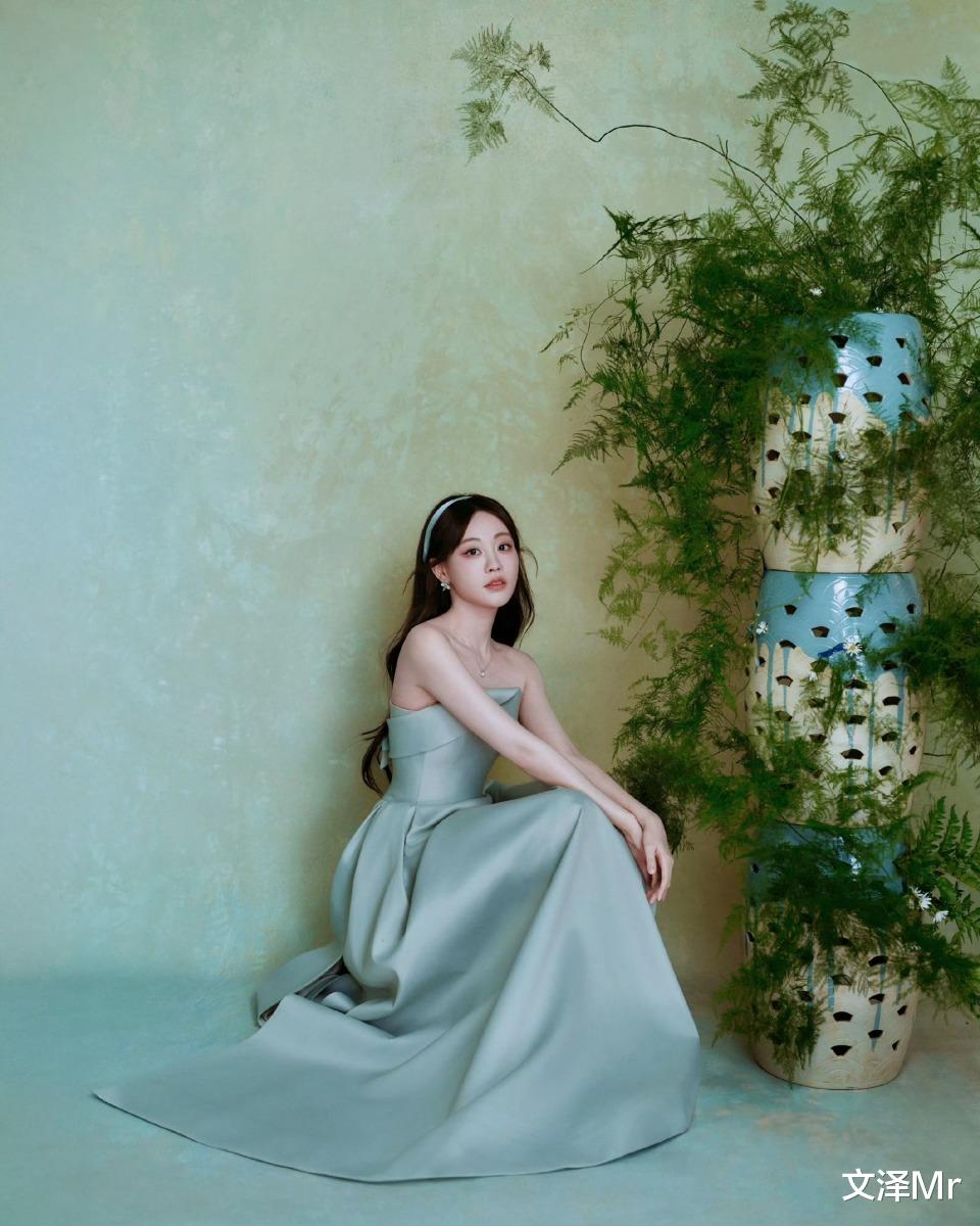 薄荷绿抹胸蓬蓬裙为祝绪丹增添了几分俏皮感。宽大的裙摆与修身上半身形成对比,进一步强调了她的纤细腰身。她慵懒地倚靠在白色物体上,单手托腮,眼神中带着一丝朦胧,仿佛刚刚从春日小憩中醒来。