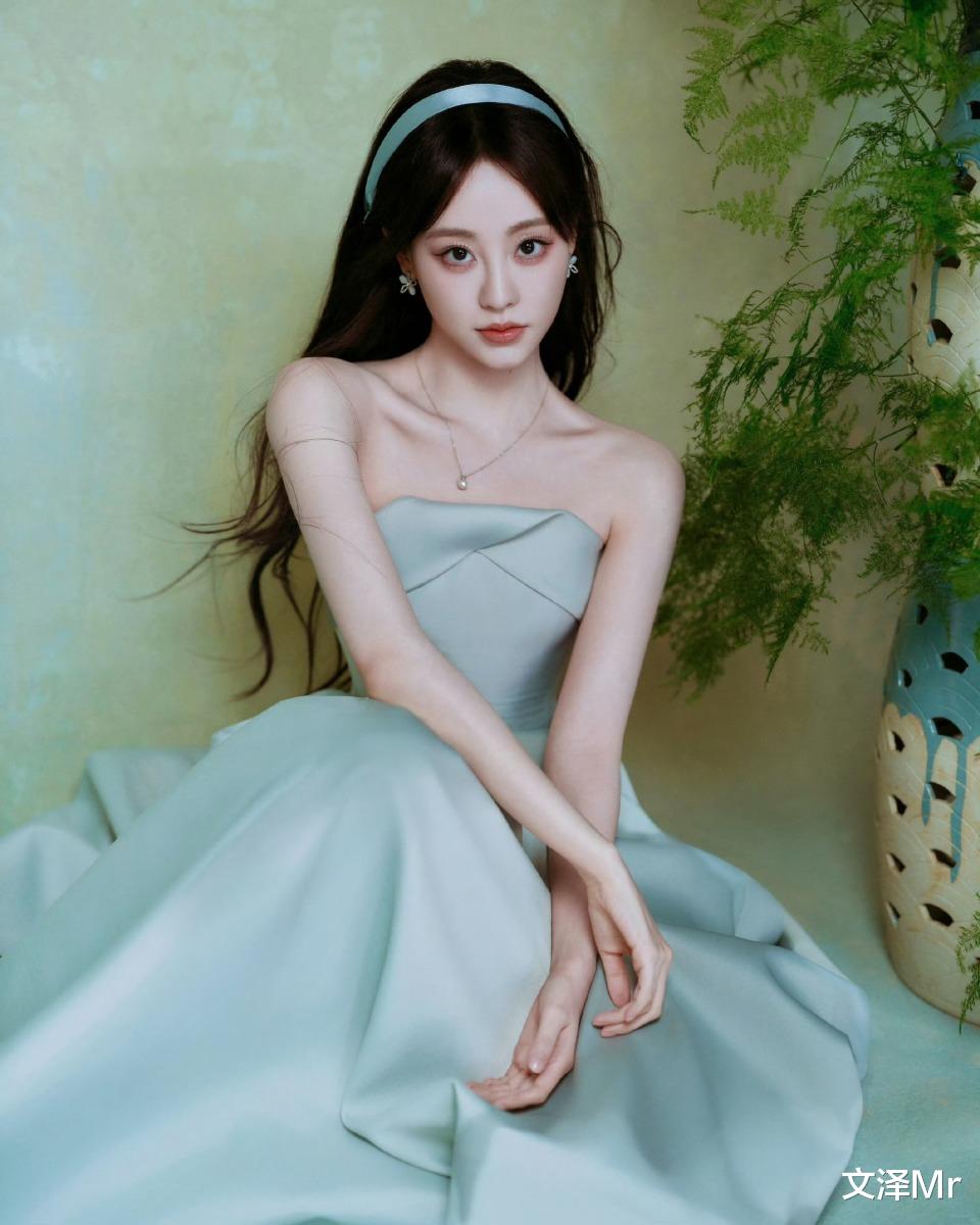 祝绪丹身着一袭淡绿色抹胸裙,仿佛春日里最柔嫩的新叶。同色系发带巧妙地束起她的长发,露出精致的侧脸线条。她颈间那颗简约的珍珠项链——不多不少,恰到好处地点亮了整个造型。这一刻,她不仅仅是演员祝绪丹,更像是从森林深处走出的精灵,与自然元素和谐共生。她的美不张扬,却让人过目难忘。