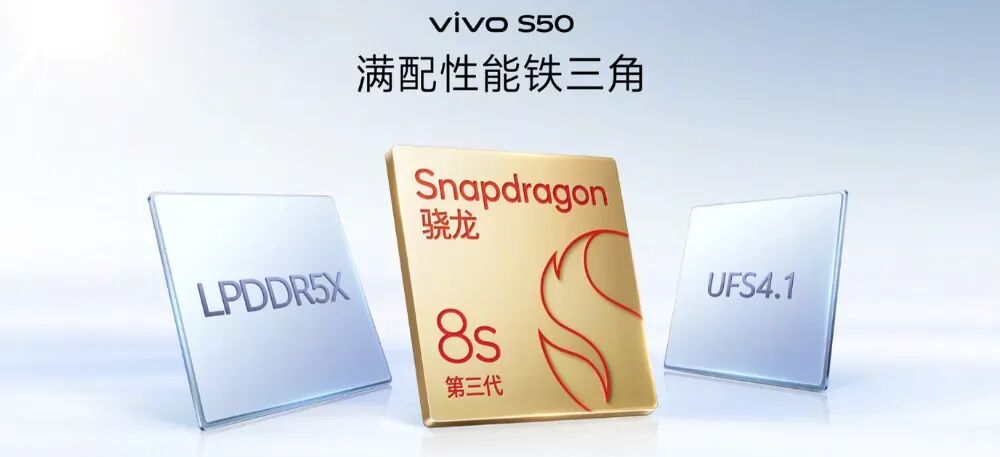 vivo S50搭载高通第三代骁龙 8s 移动平台,内置6500mAh电池,支持90W有线闪充。