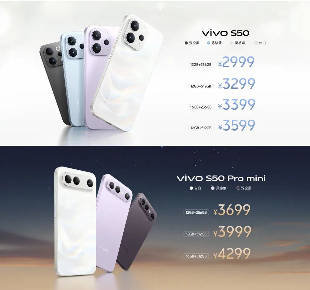 vivo S50 Pro mini,12GB+256GB版本价格3699元,12GB+512GB版本价格3999元,16GB+512GB版本价格4299元。