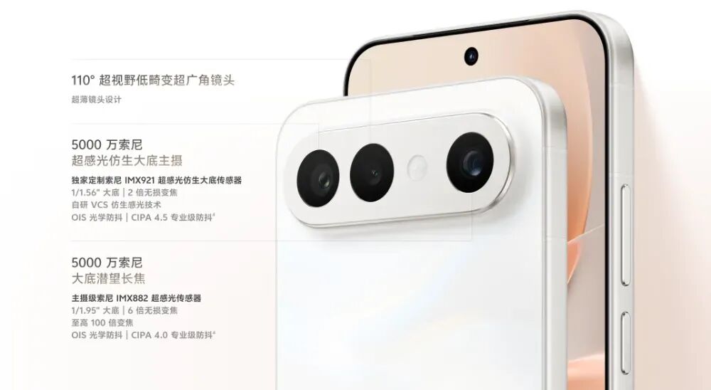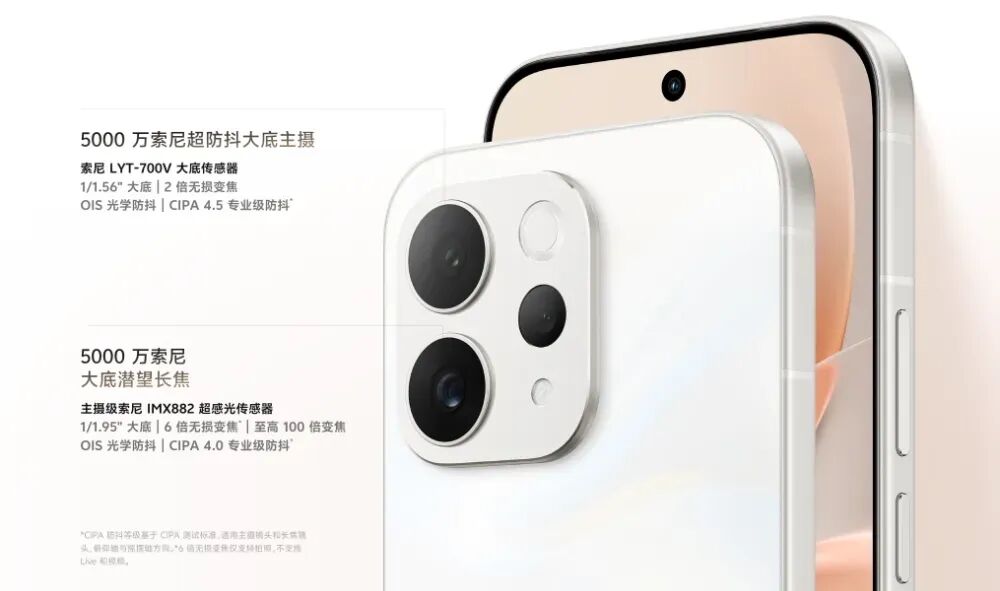 影像方面,vivo S50全系搭载索尼 IMX882 大底潜望长焦,具备更大感光面积与更佳暗光表现,支持最高 10 倍变焦;结合 vivo 自研原像引擎与大模型画质增强算法。