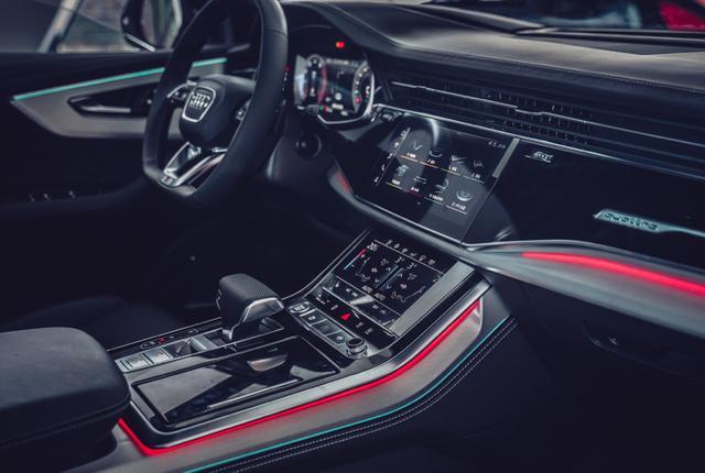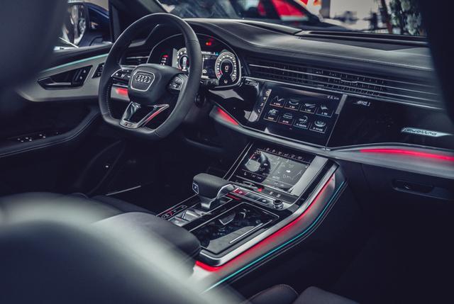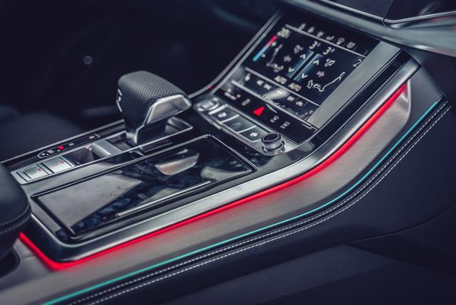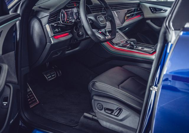 内饰部分这次奥迪Q8也带给我们很大的惊喜,虽然整体布局依然是典型的奥迪味道,但是红蓝相配的氛围灯再次诠释了奥迪在灯组方面的心得,同时也将Q8的整体内饰提升了一个档次,视觉效果极佳。