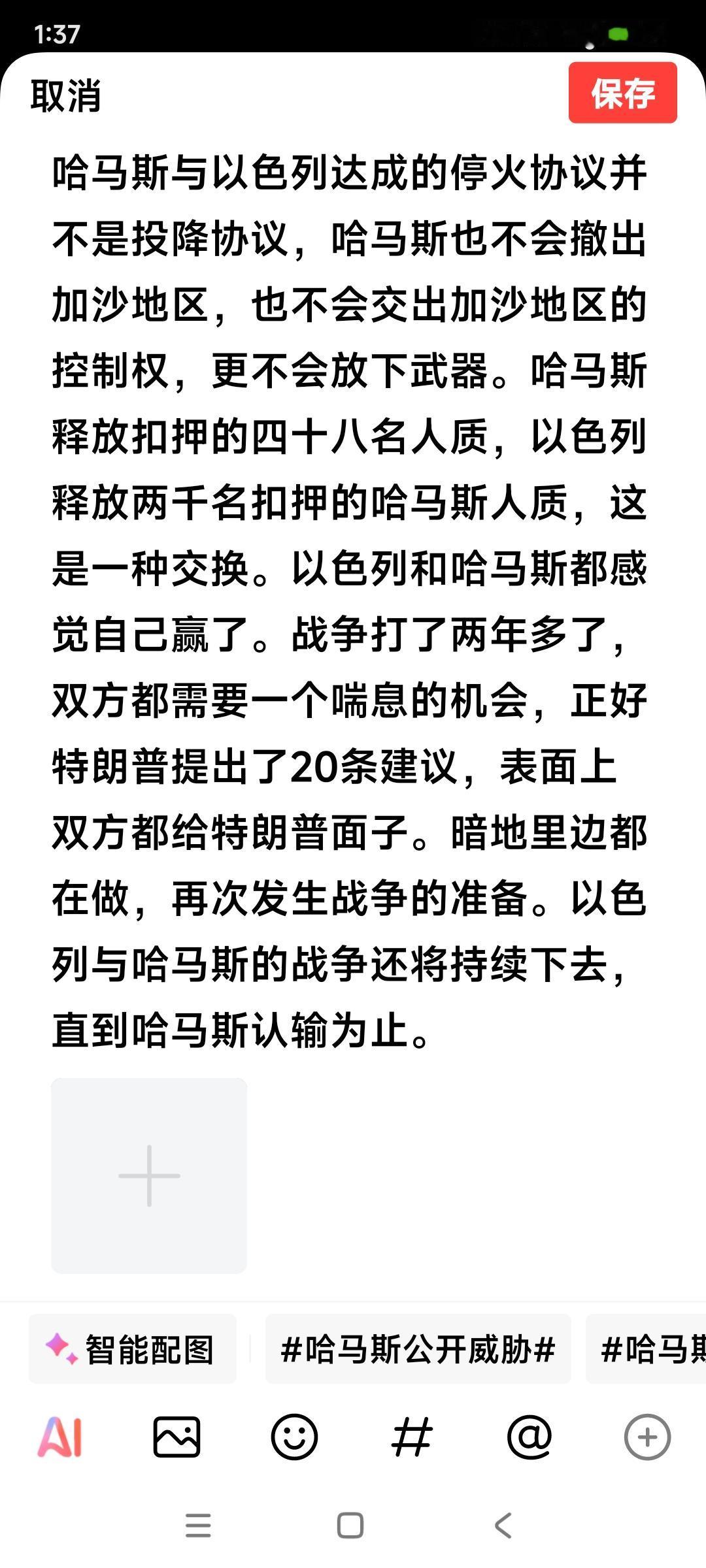 哈马斯与以色列达成的停火协议并不是投降协议,哈马斯也不会撤出加沙地区,也不会交出