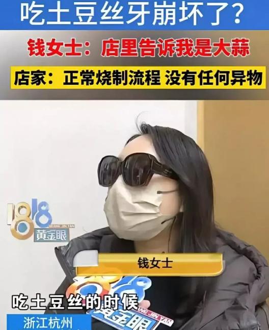 浙江杭州,钱女士在餐馆花12元点土豆丝,吃饭时牙齿被崩坏,治疗费高达1万。她找店
