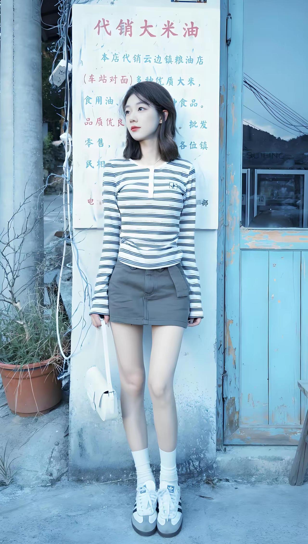 喷泉溅起的碎光,刚好落在白T恤的衣角。转身那刻,牛仔短裤裹着漫不经心的松弛,蓝鞋